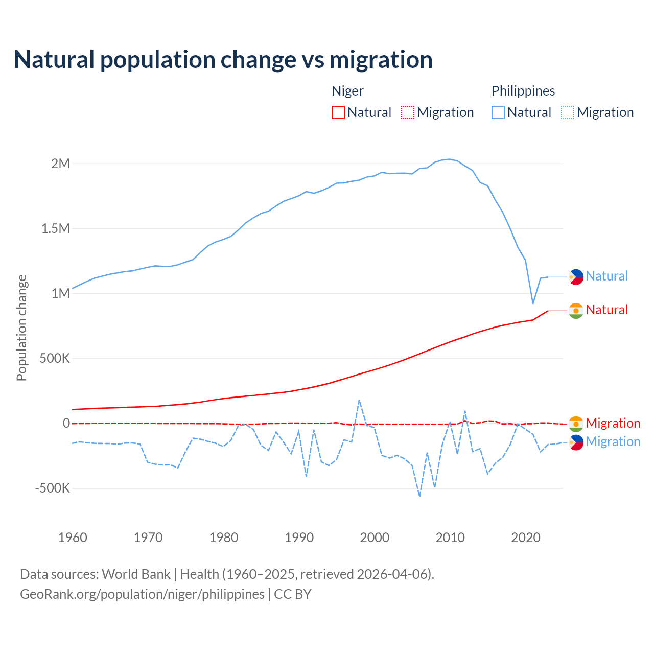 Over the last 10 years, 100% of the population change in Niger is from natural causes (a gain of 7,728,287 people) and 0.03% is from migration (a gain of 2,520 people). In the Philippines 88.5% is from natural causes (a gain of 14,279,705 people) and 11.5% is from migration (a loss of 1,848,117 people).
