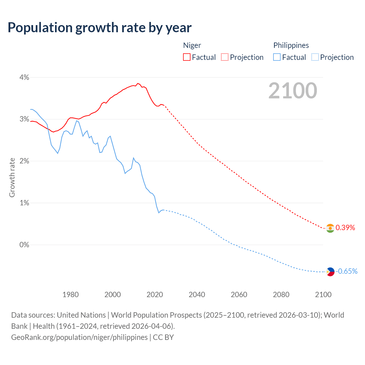 - For the last 10 years, Niger has had an average growth rate of +3.5% per year vs +1.16% in the Philippines.