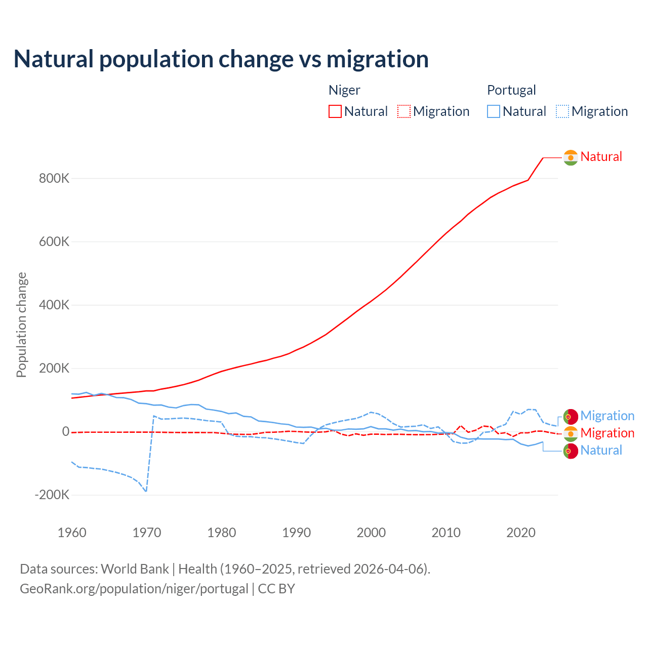 Over the last 10 years, 100% of the population change in Niger is from natural causes (a gain of 7,728,287 people) and 0.03% is from migration (a gain of 2,520 people). In Portugal 51% is from natural causes (a loss of 302,748 people) and 49% is from migration (a gain of 290,554 people).