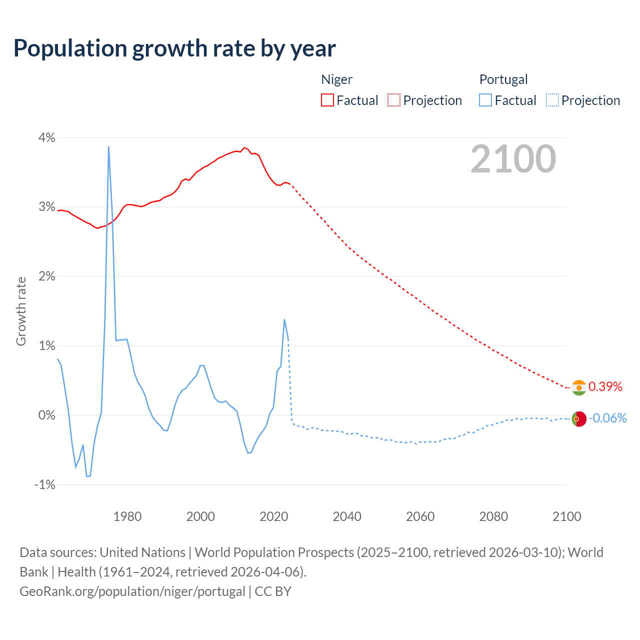 - For the last 10 years, Niger has had an average growth rate of +3.5% per year vs +0.21% in Portugal.