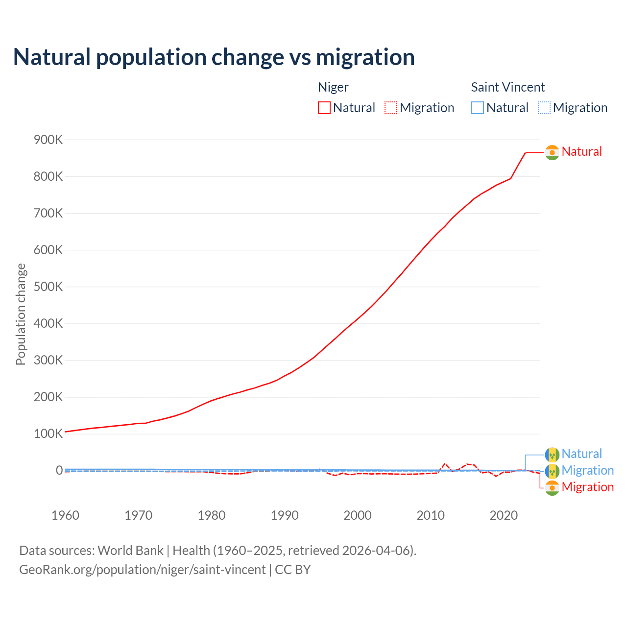 Over the last 10 years, 100% of the population change in Niger is from natural causes (a gain of 7,728,287 people) and 0.03% is from migration (a gain of 2,520 people). In Saint Vincent 21.2% is from natural causes (a gain of 2,525 people) and 78.8% is from migration (a loss of 9,393 people).