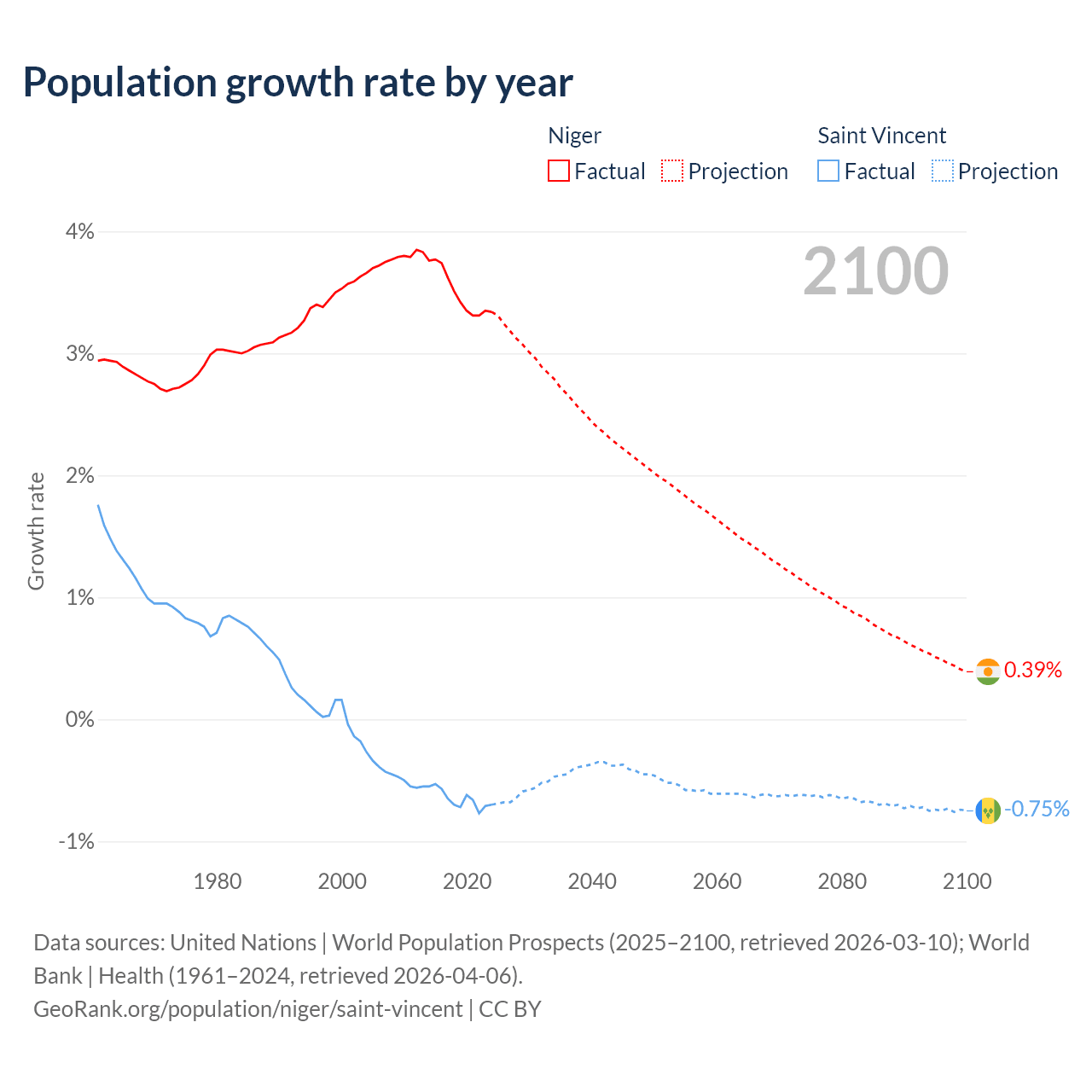 - For the last 10 years, Niger has had an average growth rate of +3.5% per year vs -0.65% in Saint Vincent.