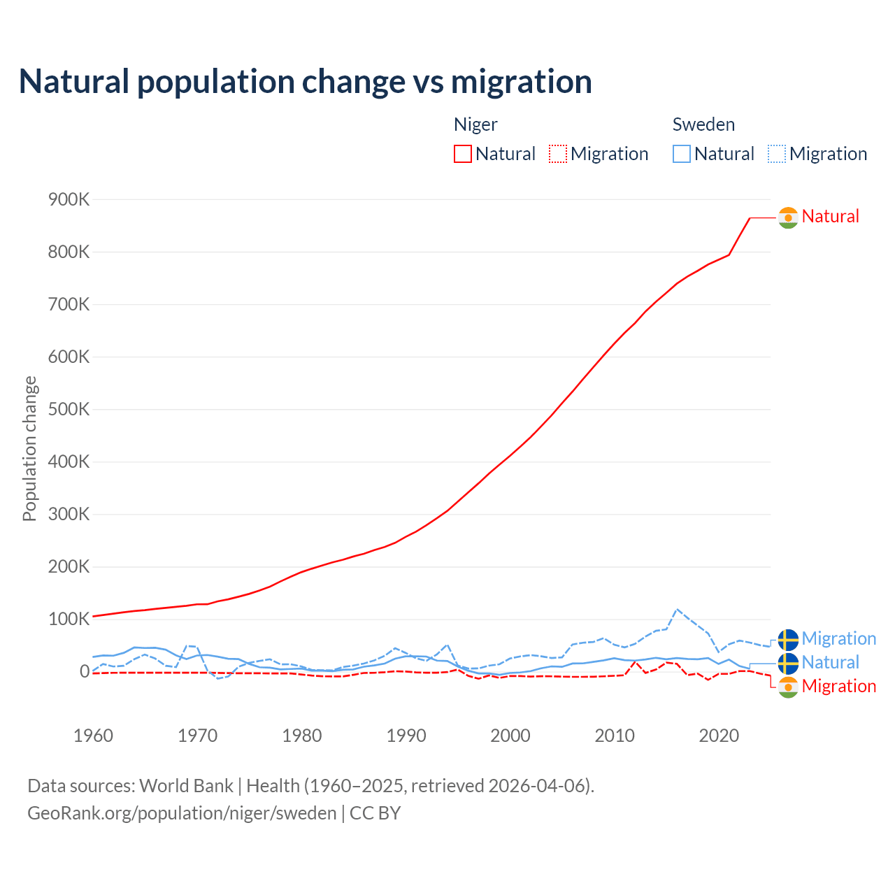 Over the last 10 years, 100% of the population change in Niger is from natural causes (a gain of 7,728,287 people) and 0.03% is from migration (a gain of 2,520 people). In Sweden 21.4% is from natural causes (a gain of 201,900 people) and 78.6% is from migration (a gain of 743,642 people).