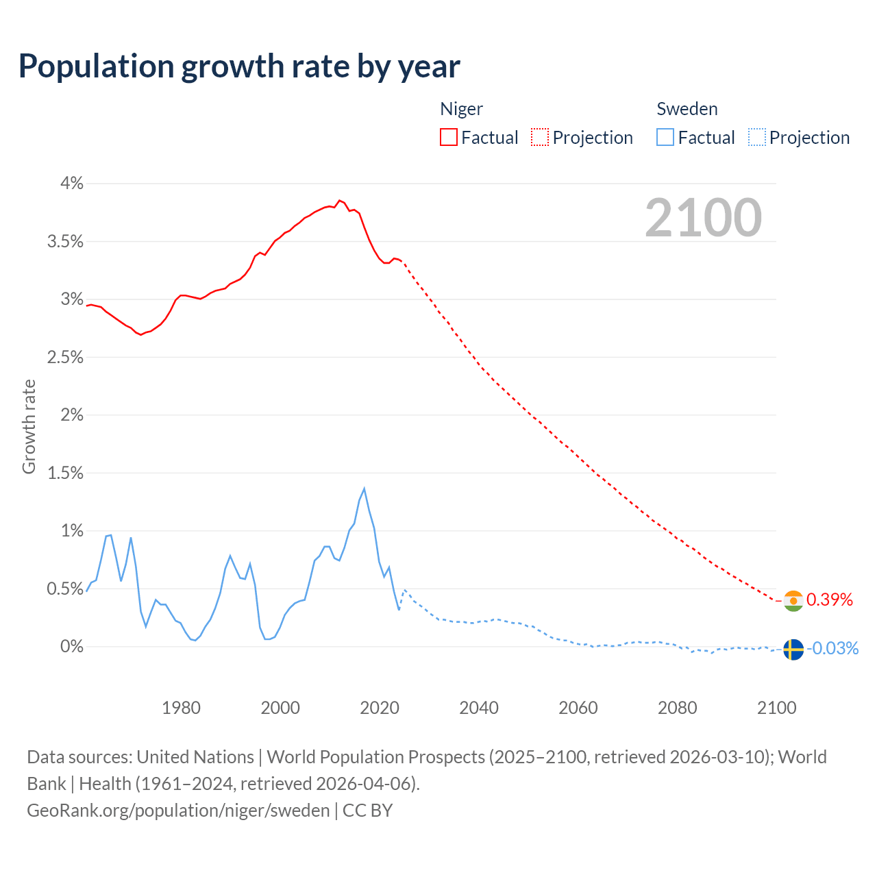- For the last 10 years, Niger has had an average growth rate of +3.5% per year vs +0.88% in Sweden.