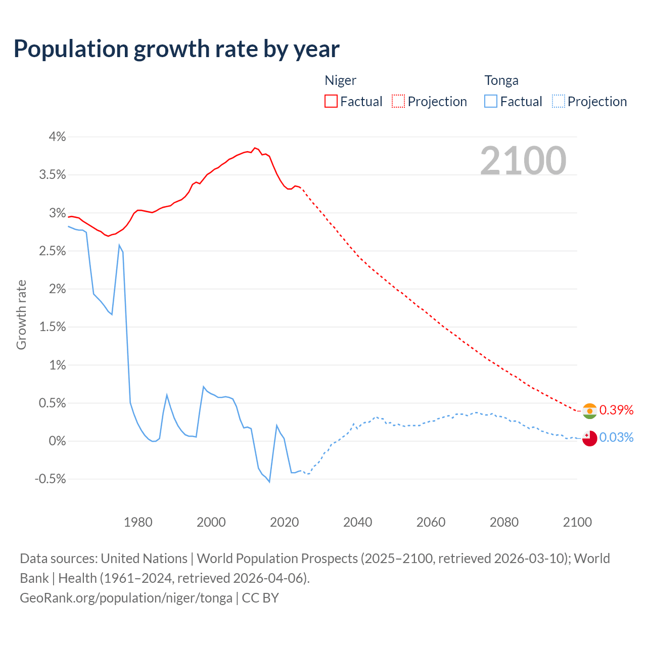 - For the last 10 years, Niger has had an average growth rate of +3.5% per year vs -0.25% in Tonga.