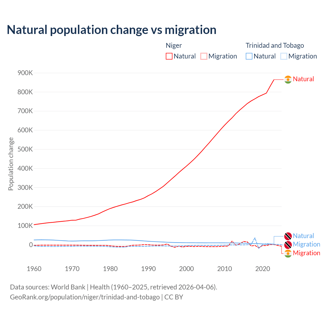 Over the last 10 years, 100% of the population change in Niger is from natural causes (a gain of 7,728,287 people) and 0.03% is from migration (a gain of 2,520 people). In Trinidad and Tobago 66% is from natural causes (a gain of 55,887 people) and 34% is from migration (a gain of 28,785 people).