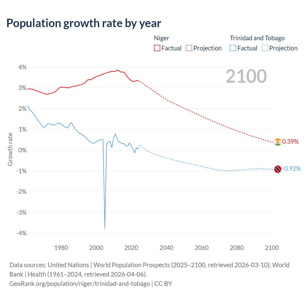 - For the last 10 years, Niger has had an average growth rate of +3.5% per year vs +0.19% in Trinidad and Tobago.