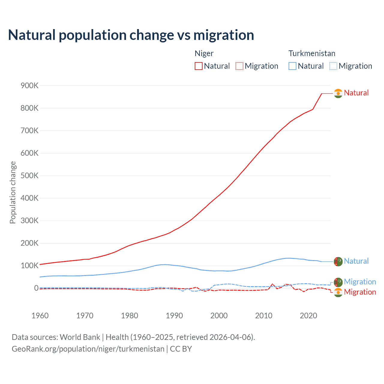 Over the last 10 years, 100% of the population change in Niger is from natural causes (a gain of 7,728,287 people) and 0.03% is from migration (a gain of 2,520 people). In Turkmenistan 89.2% is from natural causes (a gain of 1,270,228 people) and 10.8% is from migration (a gain of 154,379 people).