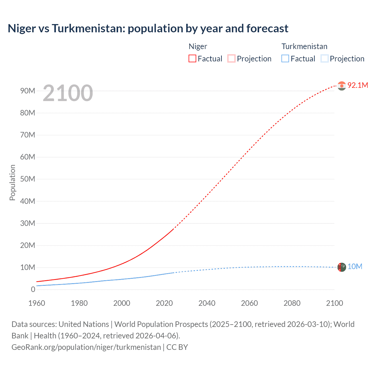 The latest officially reported population of Niger was 27,032,412 in 2024 vs 7,494,498 people in Turkmenistan in 2024. In 2026, based on the adjusted UN estimation, the current Niger's population is 29,080,898 people compared to 7,776,557 in Turkmenistan.