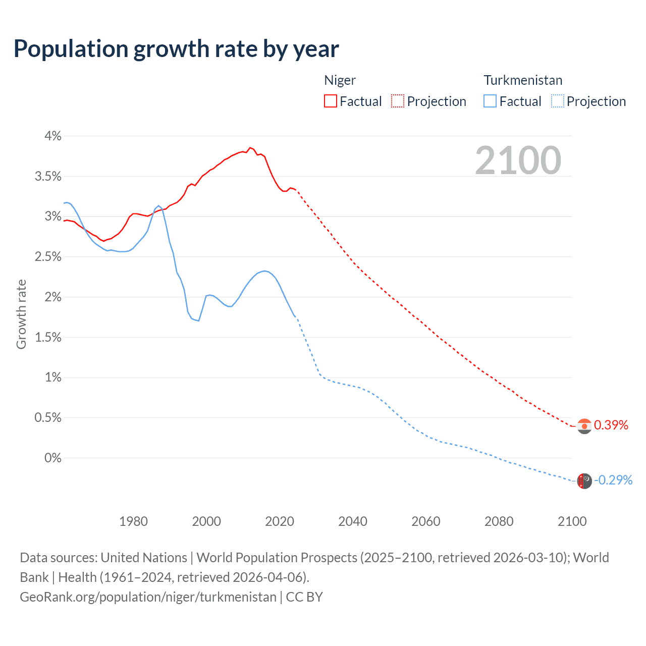- For the last 10 years, Niger has had an average growth rate of +3.5% per year vs +2.14% in Turkmenistan.