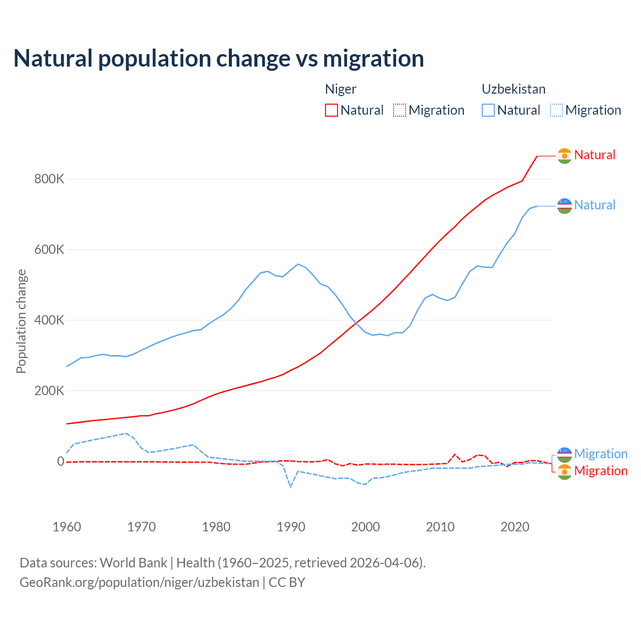 Over the last 10 years, 100% of the population change in Niger is from natural causes (a gain of 7,728,287 people) and 0.03% is from migration (a gain of 2,520 people). In Uzbekistan 98.2% is from natural causes (a gain of 6,161,117 people) and 1.84% is from migration (a loss of 115,398 people).