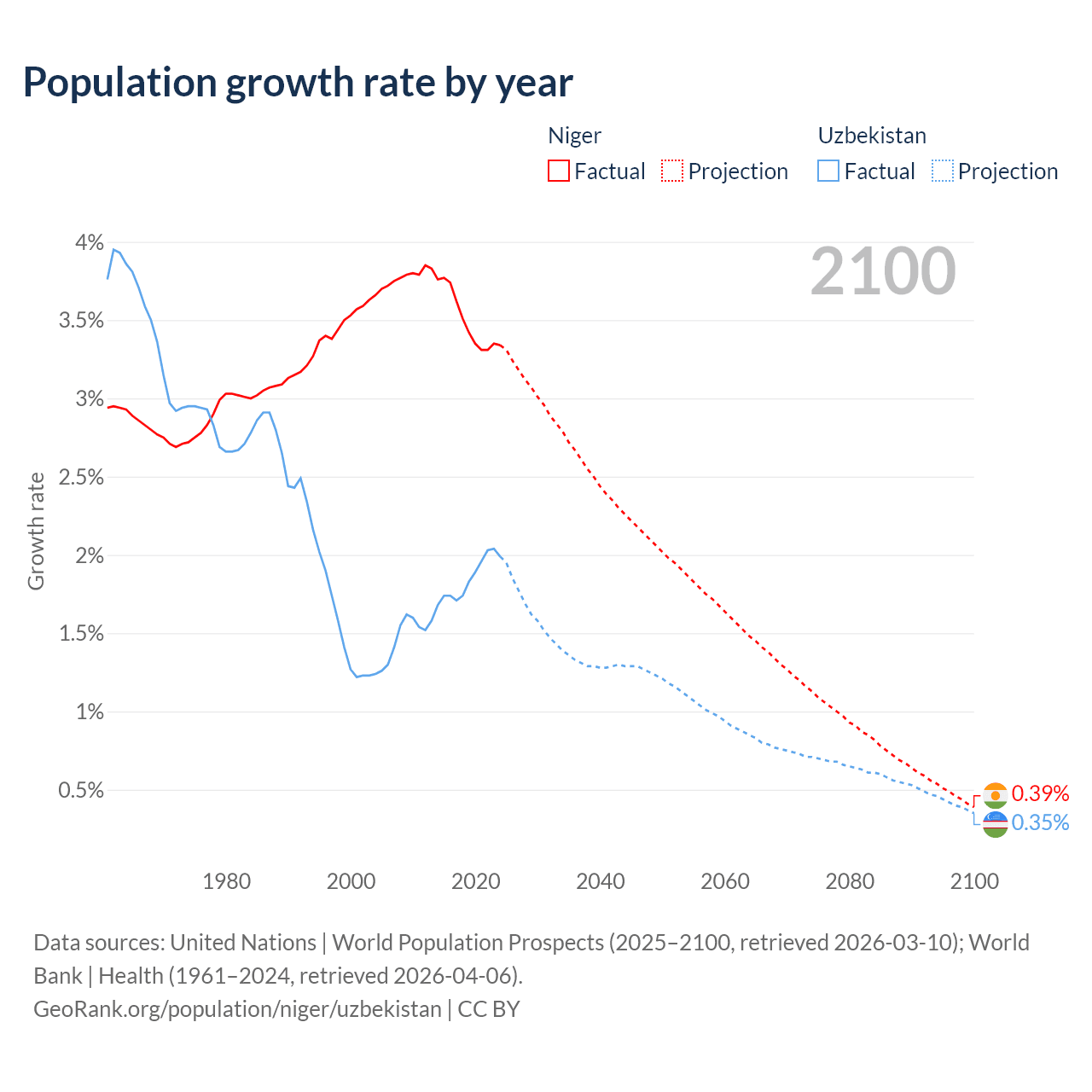 - For the last 10 years, Niger has had an average growth rate of +3.5% per year vs +1.85% in Uzbekistan.