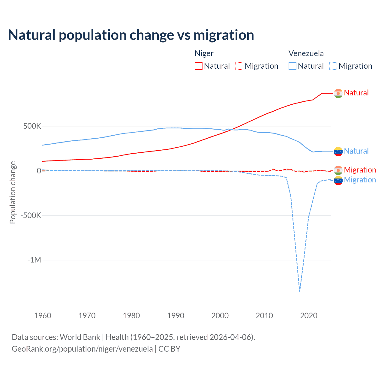 Over the last 10 years, 100% of the population change in Niger is from natural causes (a gain of 7,728,287 people) and 0.03% is from migration (a gain of 2,520 people). In Venezuela 38.6% is from natural causes (a gain of 2,946,257 people) and 61.4% is from migration (a loss of 4,683,227 people).