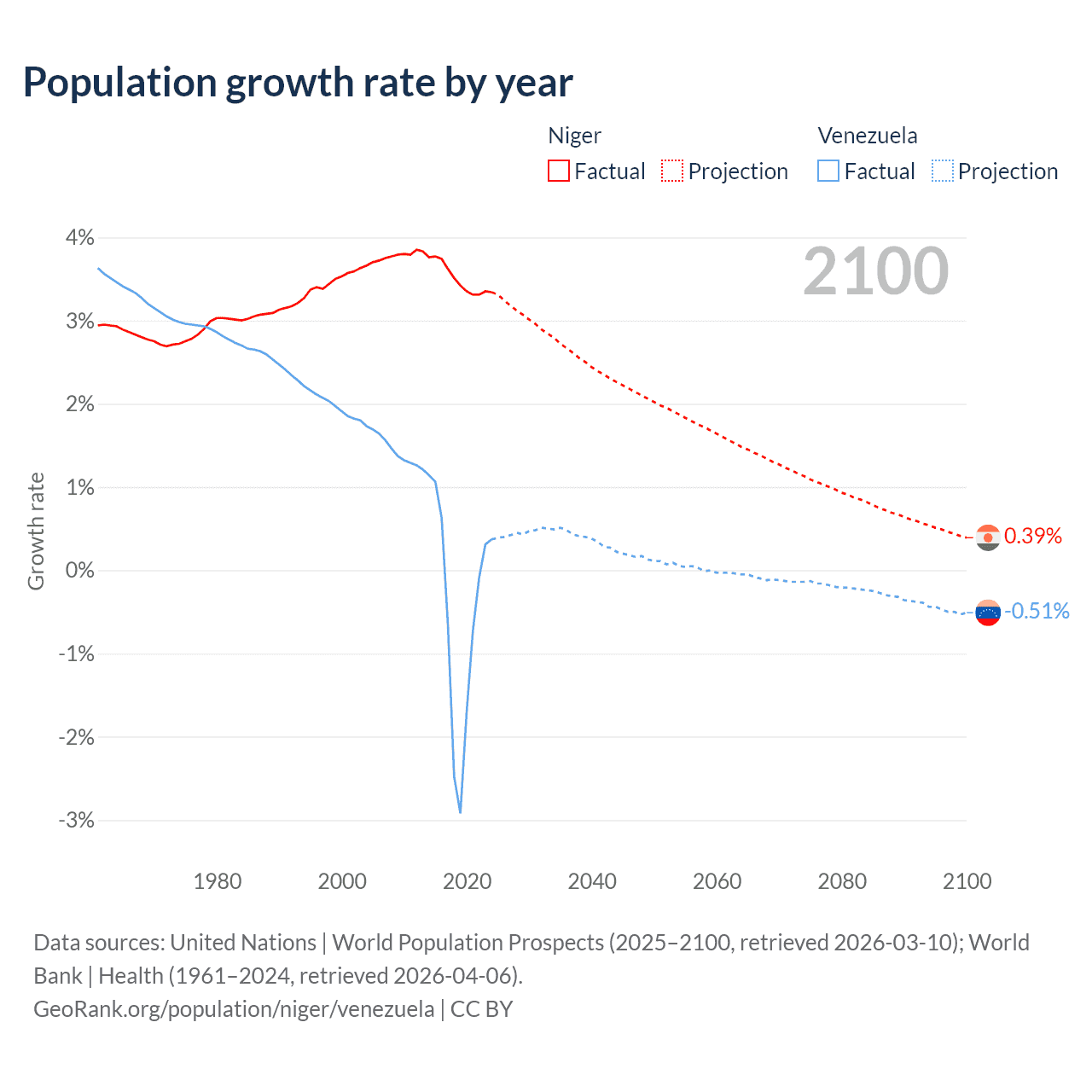 - For the last 10 years, Niger has had an average growth rate of +3.5% per year vs -0.46% in Venezuela.