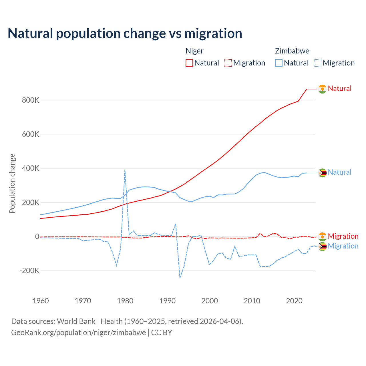 Over the last 10 years, 100% of the population change in Niger is from natural causes (a gain of 7,728,287 people) and 0.03% is from migration (a gain of 2,520 people). In Zimbabwe 74.9% is from natural causes (a gain of 3,558,487 people) and 25.1% is from migration (a loss of 1,192,807 people).