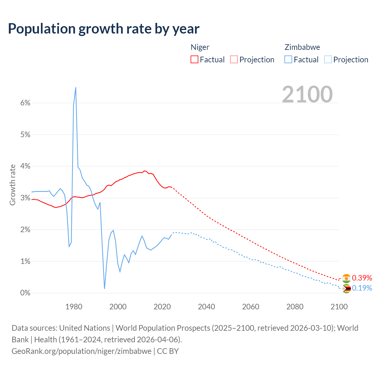 - For the last 10 years, Niger has had an average growth rate of +3.5% per year vs +1.57% in Zimbabwe.