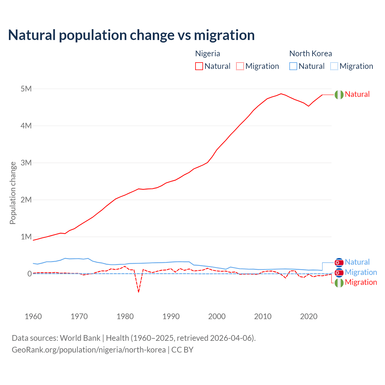 Over the last 10 years, 99.2% of the population change in Nigeria is from natural causes (a gain of 47,163,517 people) and 0.77% is from migration (a loss of 368,103 people). In North Korea 97.7% is from natural causes (a gain of 1,097,372 people) and 2.33% is from migration (a loss of 26,227 people).