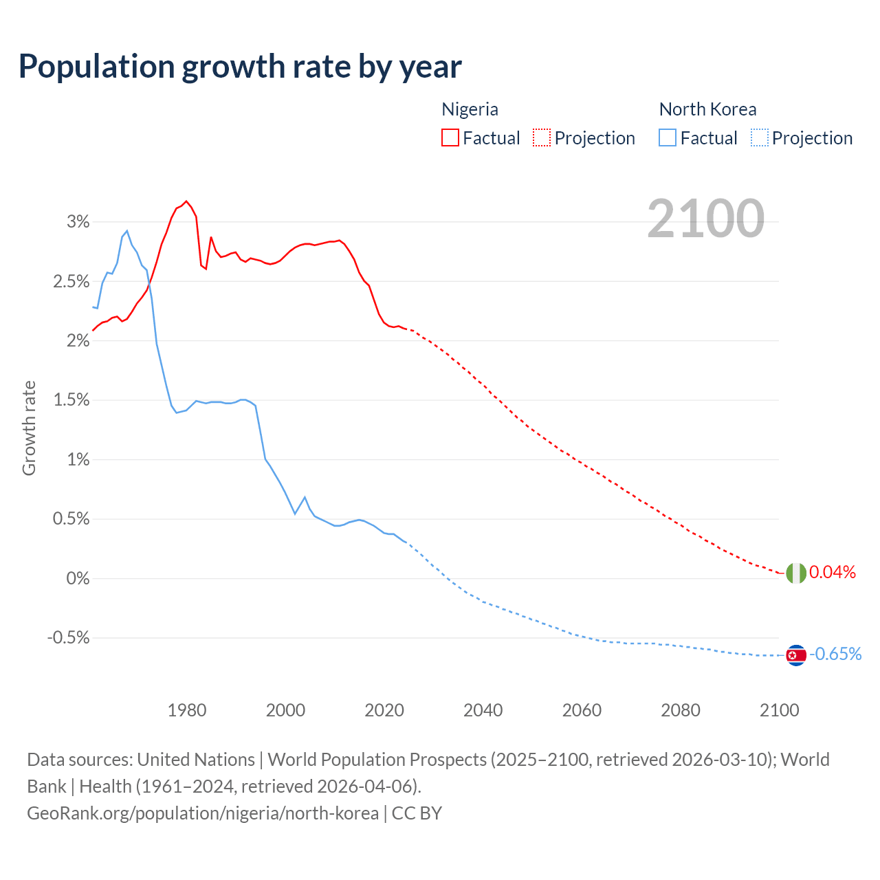 Data sources: World Bank | Health (1960–2024, retrieved 2026-04-06); United Nations | World Population Prospects (1960–2026, retrieved 2026-03-10); U.S. Census Bureau (1960–2025, retrieved 2026-02-08); Central Intelligence Agency (CIA) (2000–2019, retrieved 2026-02-20).