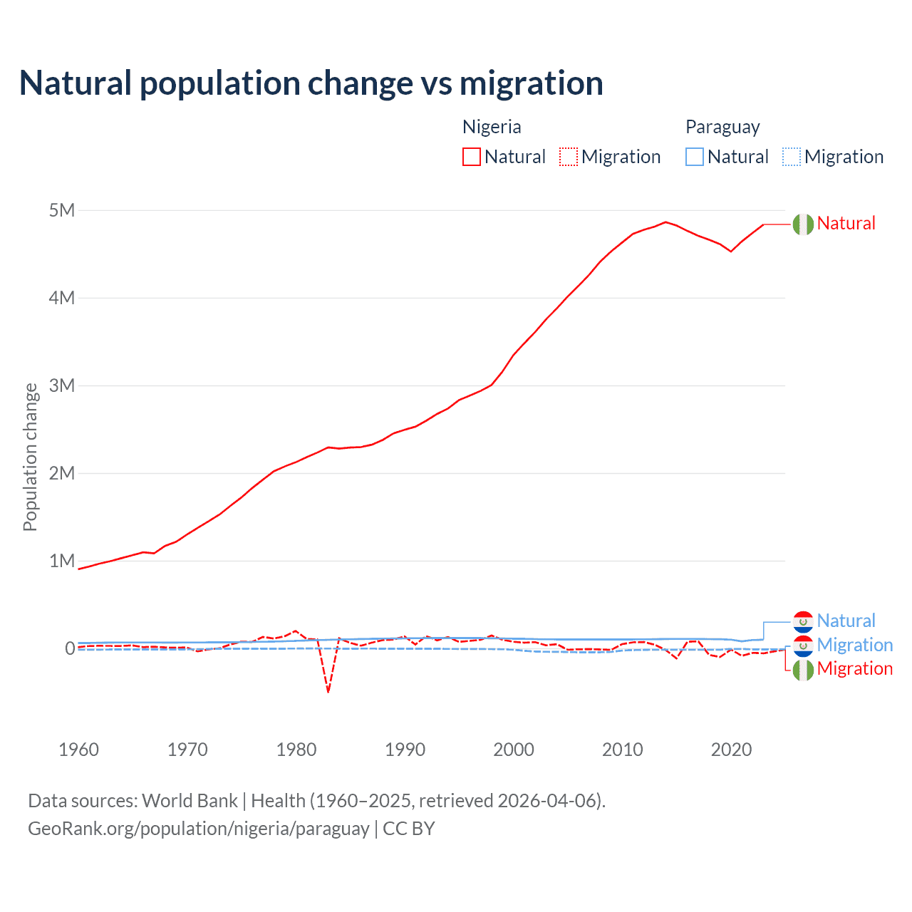 Over the last 10 years, 99.2% of the population change in Nigeria is from natural causes (a gain of 47,163,517 people) and 0.77% is from migration (a loss of 368,103 people). In Paraguay 87.6% is from natural causes (a gain of 1,002,636 people) and 12.4% is from migration (a loss of 141,377 people).