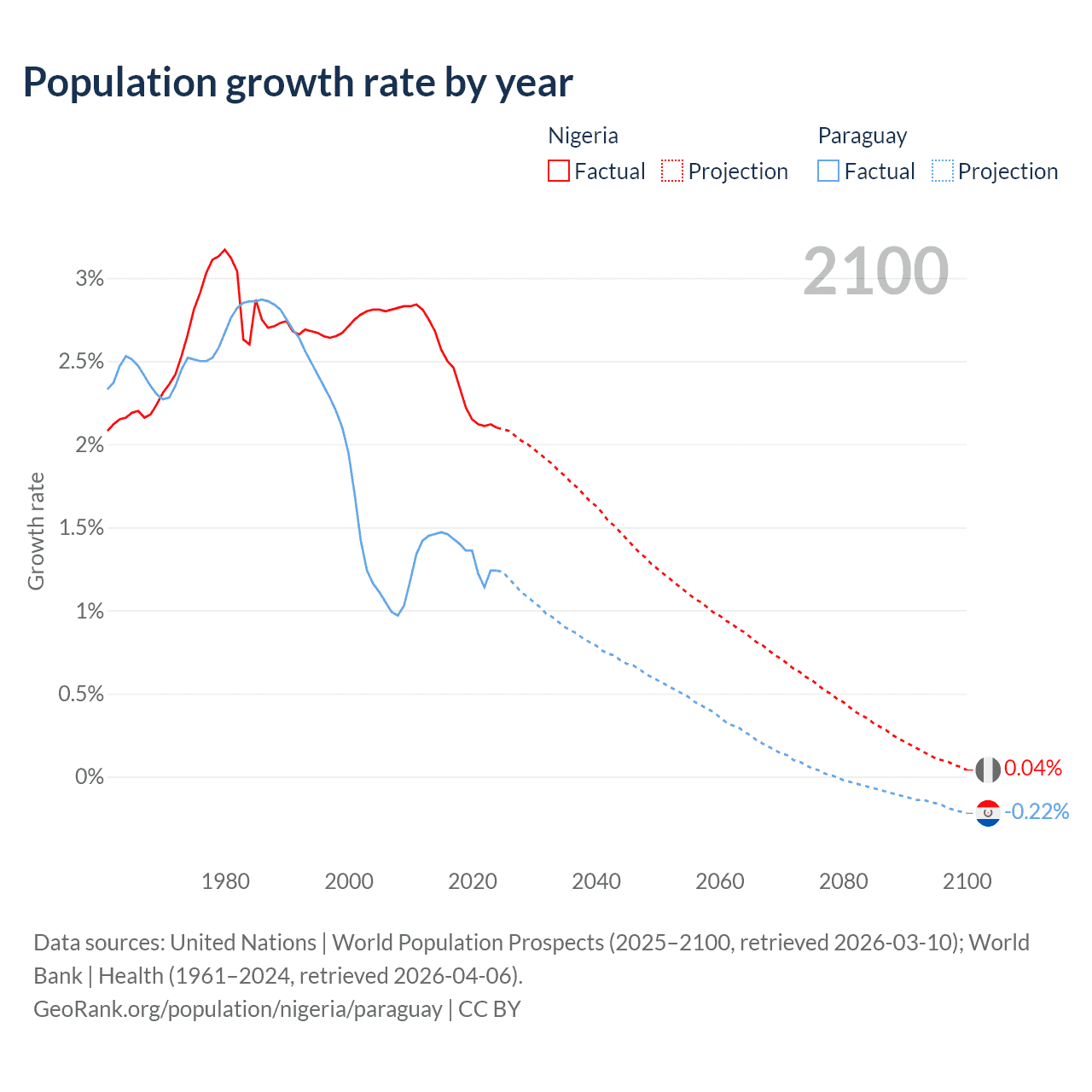 - For the last 10 years, Nigeria has had an average growth rate of +2.31% per year vs +1.34% in Paraguay.