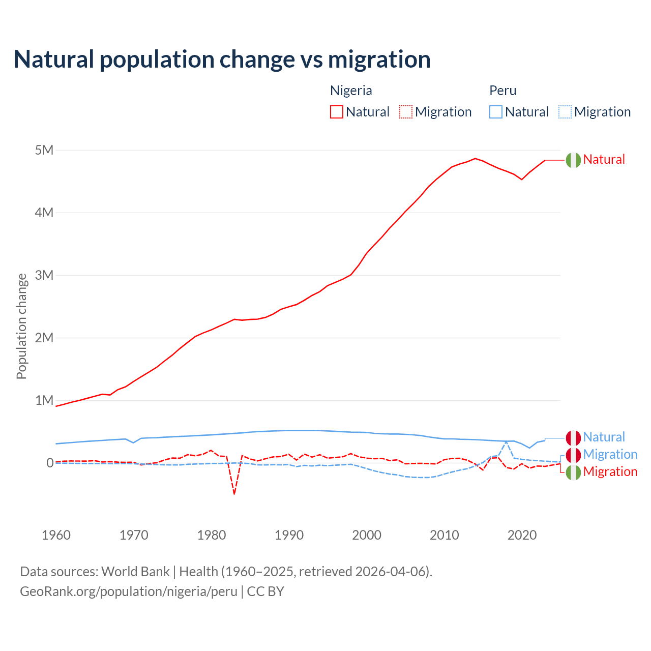 Over the last 10 years, 99.2% of the population change in Nigeria is from natural causes (a gain of 47,163,517 people) and 0.77% is from migration (a loss of 368,103 people). In Peru 82% is from natural causes (a gain of 3,345,822 people) and 18% is from migration (a gain of 732,505 people).