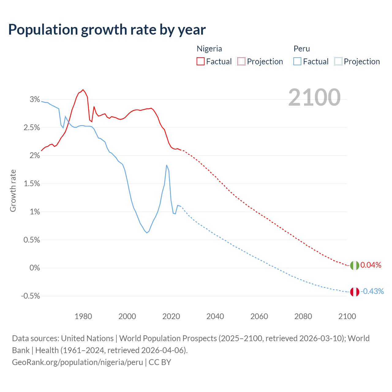 - For the last 10 years, Nigeria has had an average growth rate of +2.31% per year vs +1.26% in Peru.