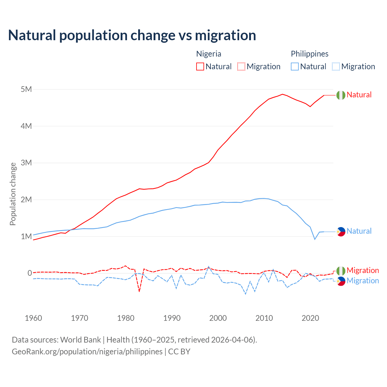 Over the last 10 years, 99.2% of the population change in Nigeria is from natural causes (a gain of 47,163,517 people) and 0.77% is from migration (a loss of 368,103 people). In the Philippines 88.5% is from natural causes (a gain of 14,279,705 people) and 11.5% is from migration (a loss of 1,848,117 people).