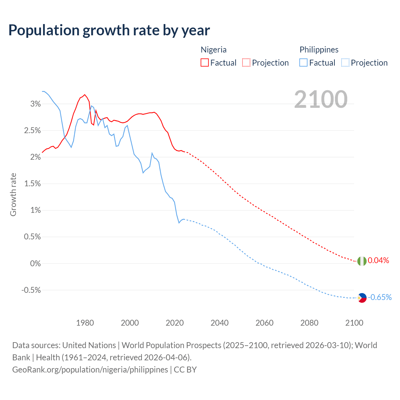 - For the last 10 years, Nigeria has had an average growth rate of +2.31% per year vs +1.16% in the Philippines.