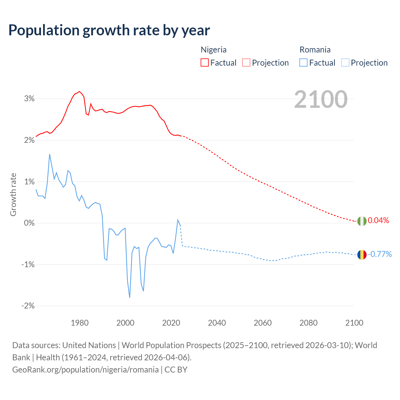 - For the last 10 years, Nigeria has had an average growth rate of +2.31% per year vs -0.43% in Romania.