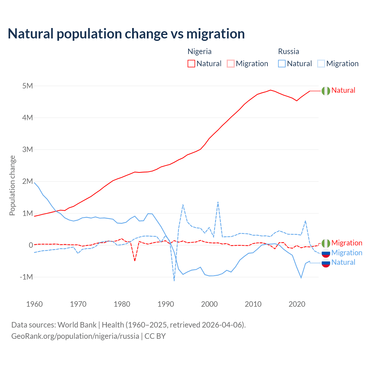 Over the last 10 years, 99.2% of the population change in Nigeria is from natural causes (a gain of 47,163,517 people) and 0.77% is from migration (a loss of 368,103 people). In Russia 48.6% is from natural causes (a loss of 3,416,377 people) and 51.4% is from migration (a gain of 3,611,826 people).