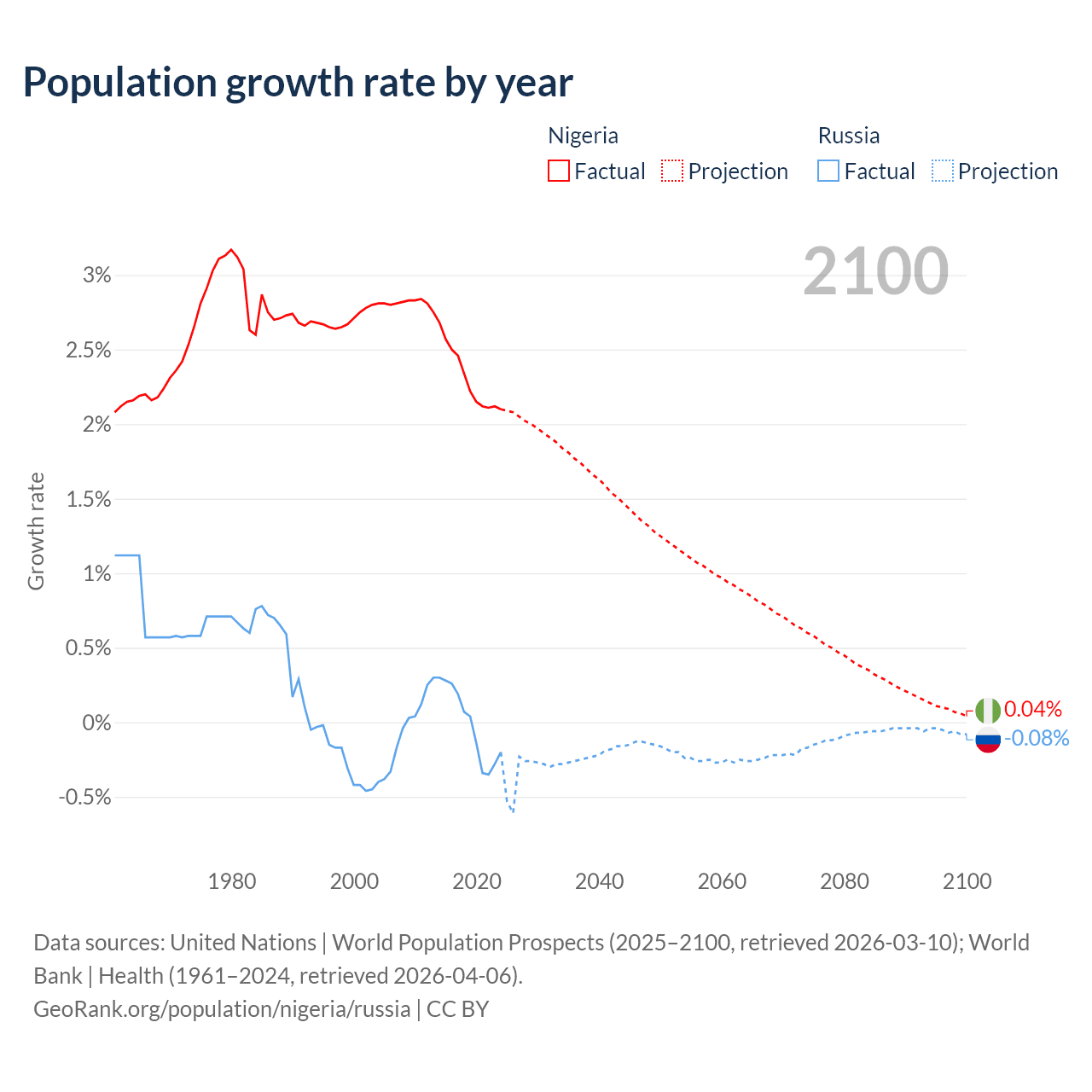 - For the last 10 years, Nigeria has had an average growth rate of +2.31% per year vs -0.02% in Russia.