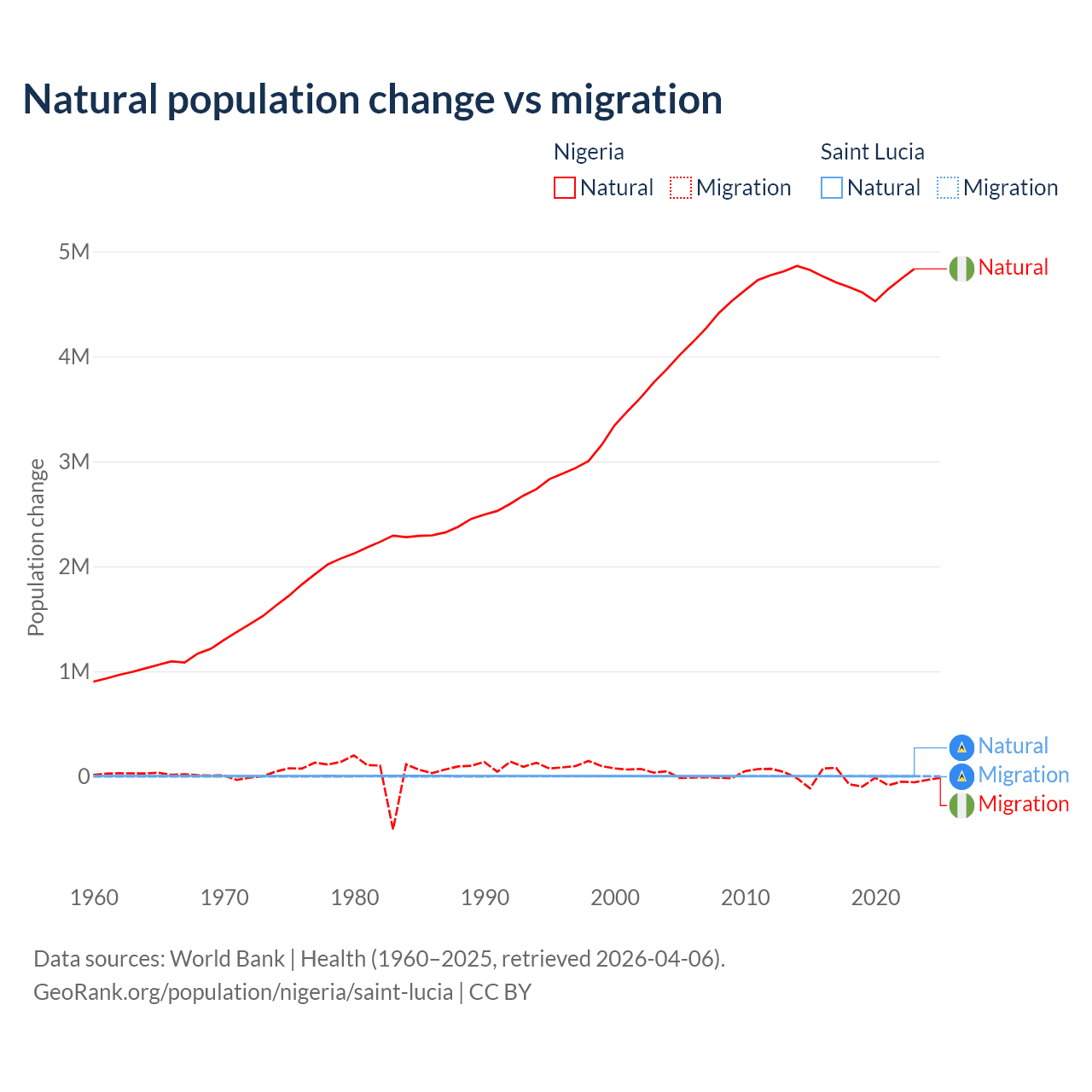 Over the last 10 years, 99.2% of the population change in Nigeria is from natural causes (a gain of 47,163,517 people) and 0.77% is from migration (a loss of 368,103 people). In Saint Lucia 95.7% is from natural causes (a gain of 6,039 people) and 4.31% is from migration (a loss of 272 people).