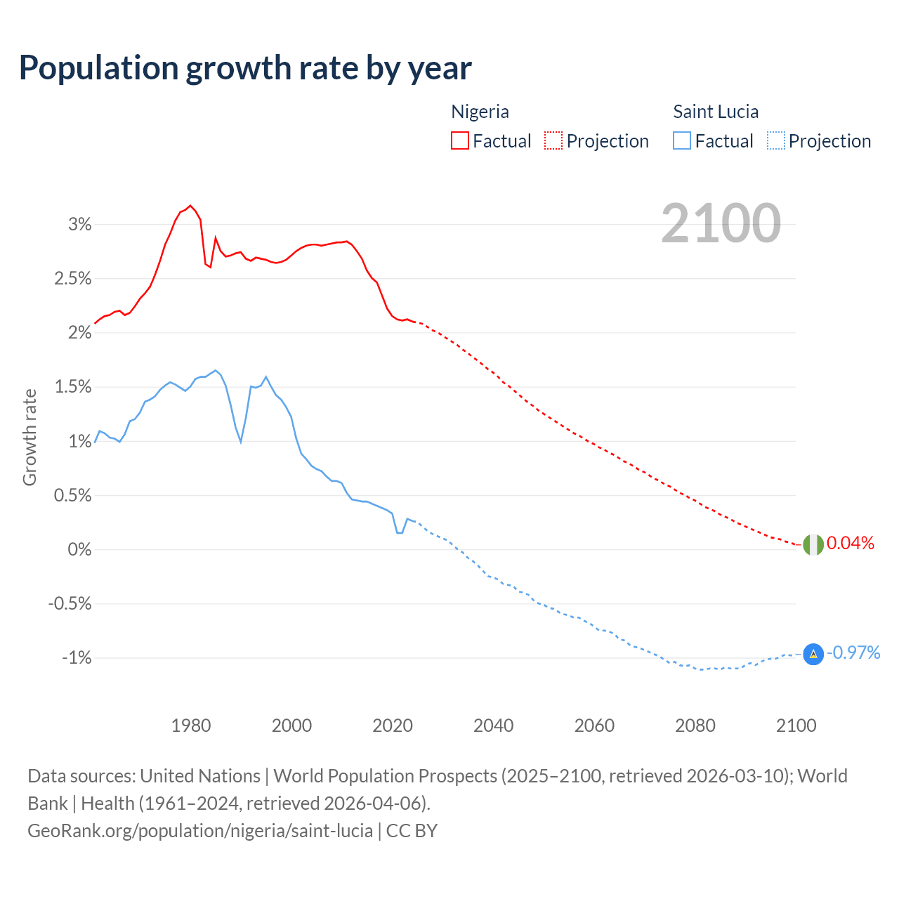 - For the last 10 years, Nigeria has had an average growth rate of +2.31% per year vs +0.33% in Saint Lucia.