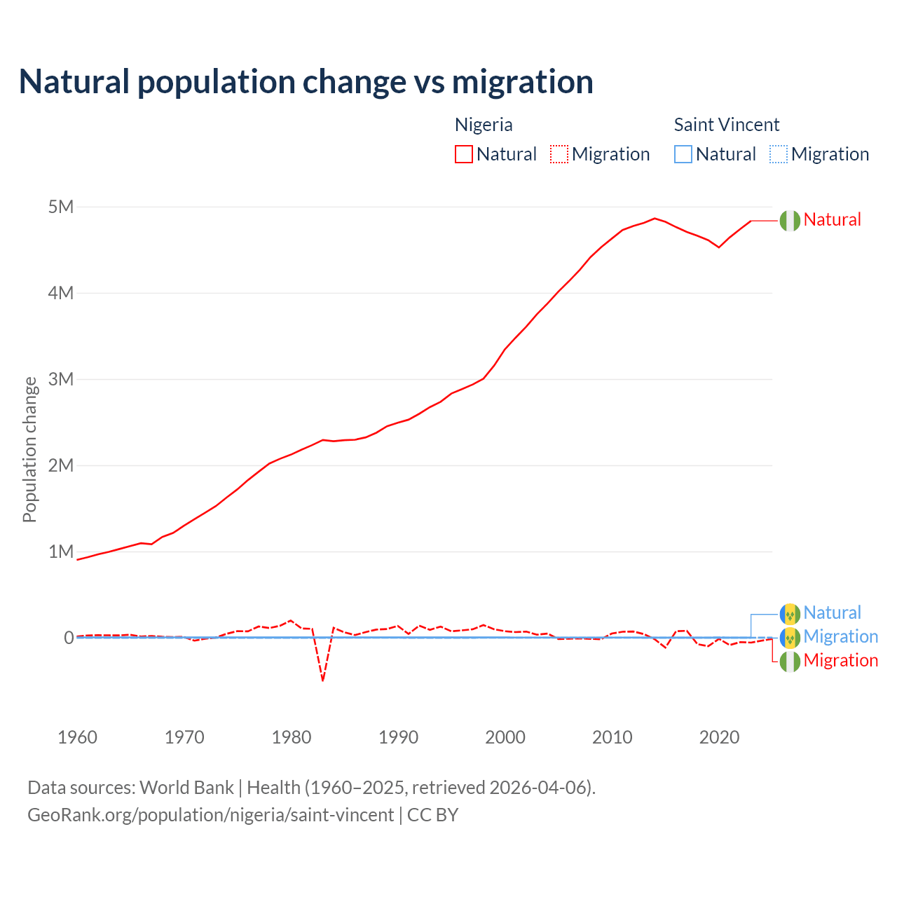 Over the last 10 years, 99.2% of the population change in Nigeria is from natural causes (a gain of 47,163,517 people) and 0.77% is from migration (a loss of 368,103 people). In Saint Vincent 21.2% is from natural causes (a gain of 2,525 people) and 78.8% is from migration (a loss of 9,393 people).