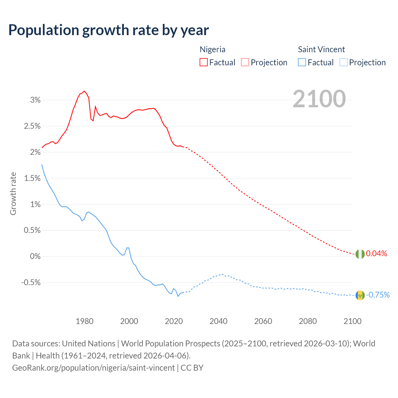 - For the last 10 years, Nigeria has had an average growth rate of +2.31% per year vs -0.65% in Saint Vincent.