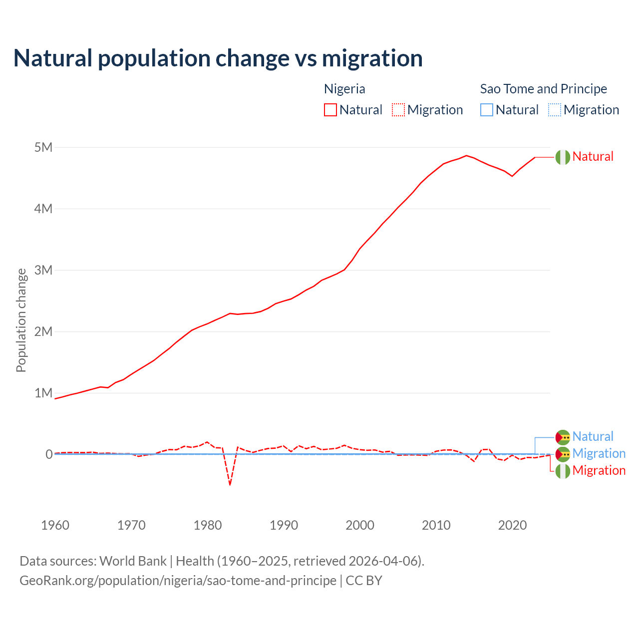 Over the last 10 years, 99.2% of the population change in Nigeria is from natural causes (a gain of 47,163,517 people) and 0.77% is from migration (a loss of 368,103 people). In Sao Tome and Principe 80.1% is from natural causes (a gain of 50,822 people) and 19.9% is from migration (a loss of 12,621 people).