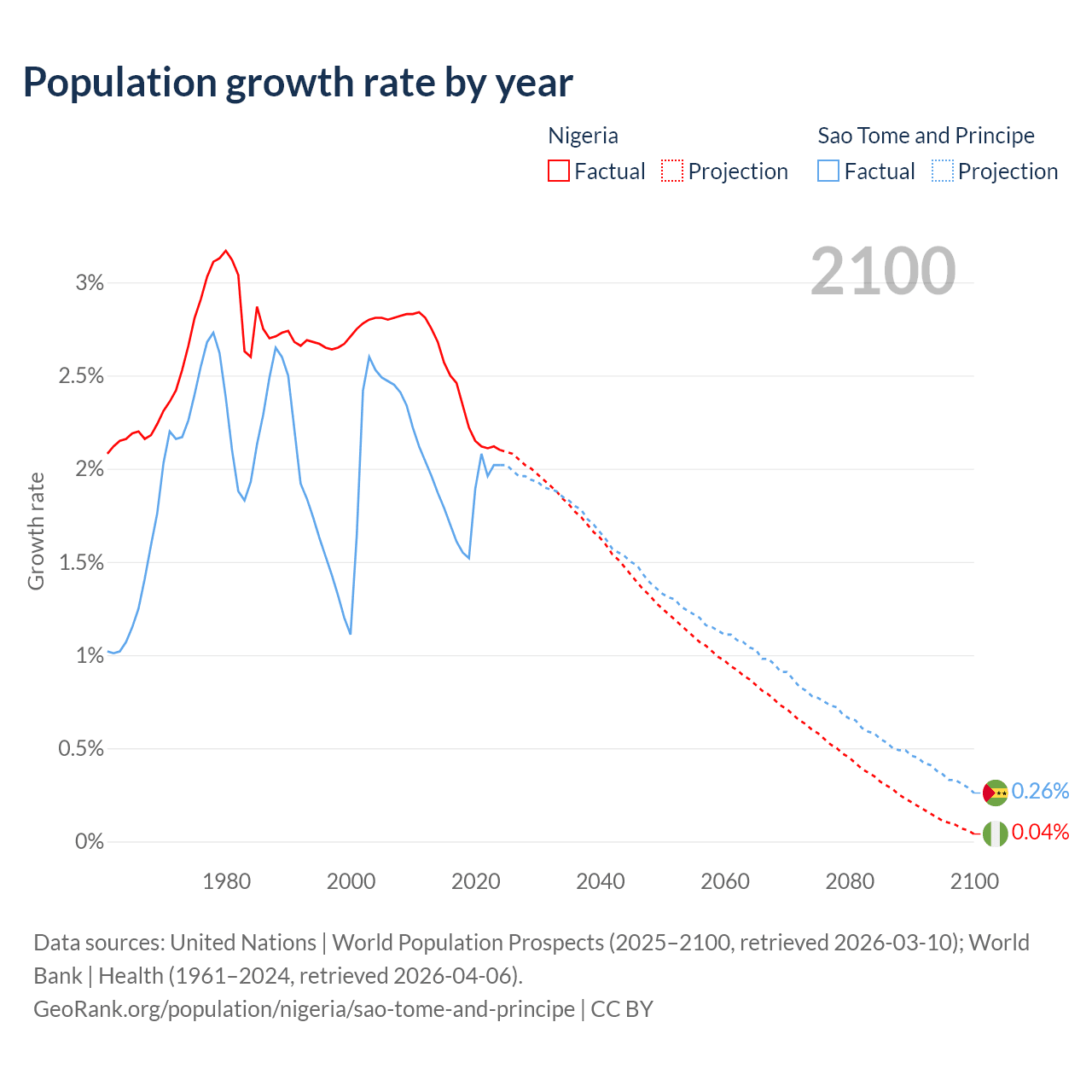 - For the last 10 years, Nigeria has had an average growth rate of +2.31% per year vs +1.82% in Sao Tome and Principe.