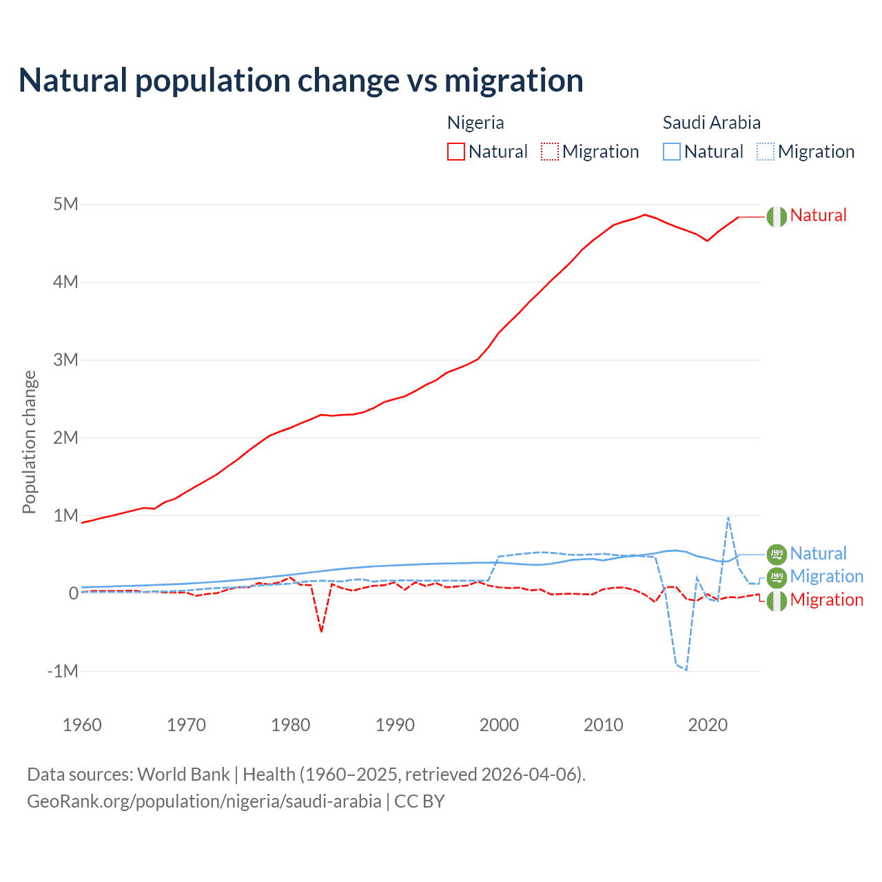 Over the last 10 years, 99.2% of the population change in Nigeria is from natural causes (a gain of 47,163,517 people) and 0.77% is from migration (a loss of 368,103 people). In Saudi Arabia 93.9% is from natural causes (a gain of 4,829,562 people) and 6.05% is from migration (a gain of 311,209 people).
