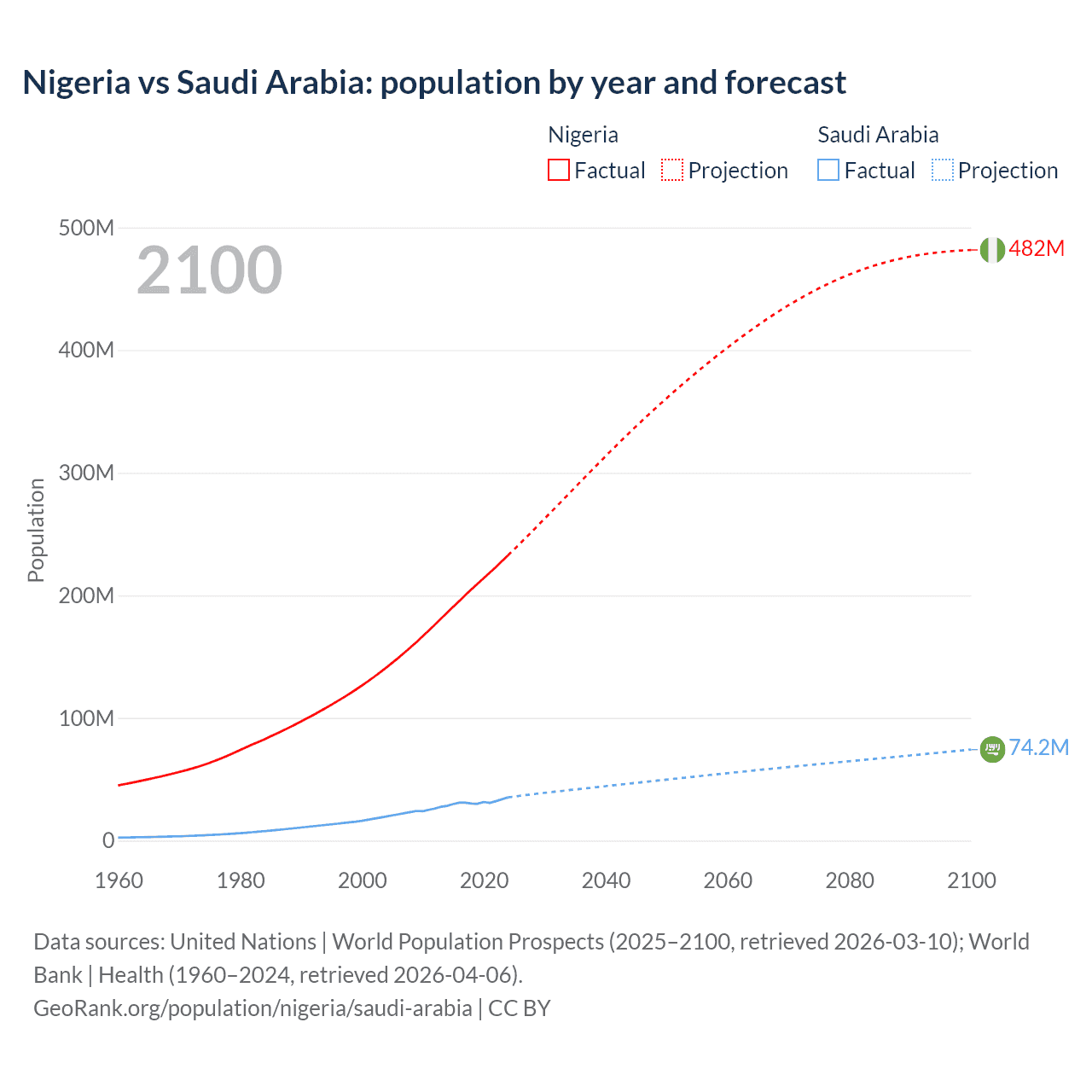 The latest officially reported population of Nigeria was 232,679,478 in 2024 vs 35,300,280 people in Saudi Arabia in 2024. In 2026, based on the adjusted UN estimation, the current Nigeria's population is 243,824,469 people compared to 36,734,925 in Saudi Arabia.