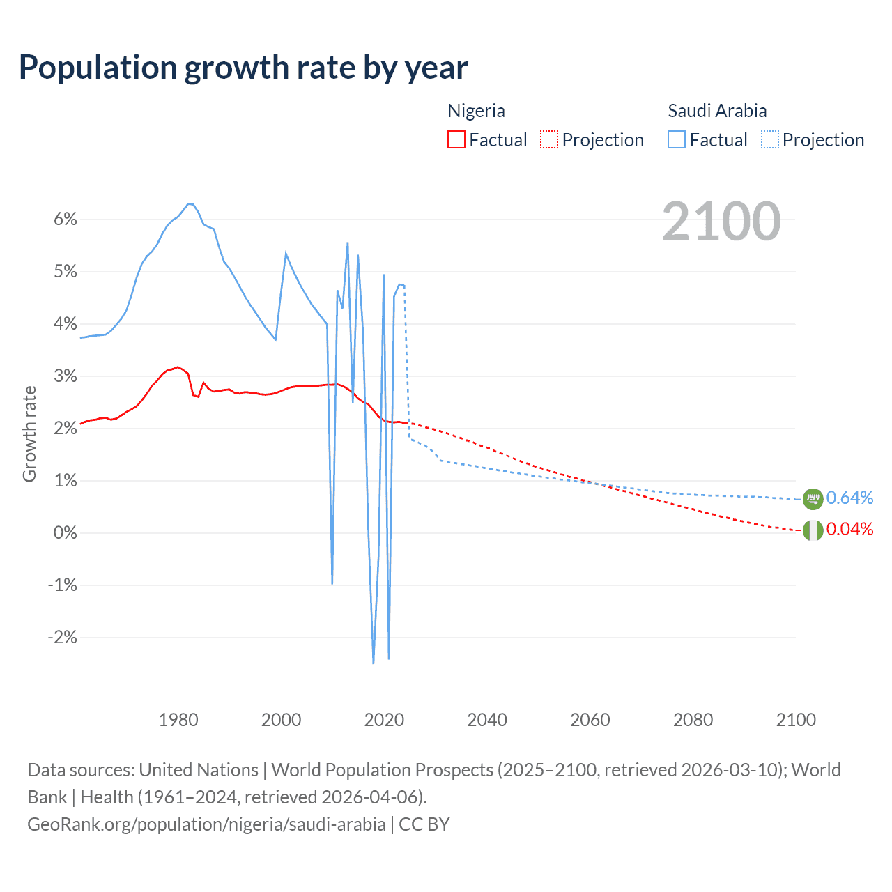 - For the last 10 years, Nigeria has had an average growth rate of +2.31% per year vs +2.3% in Saudi Arabia.