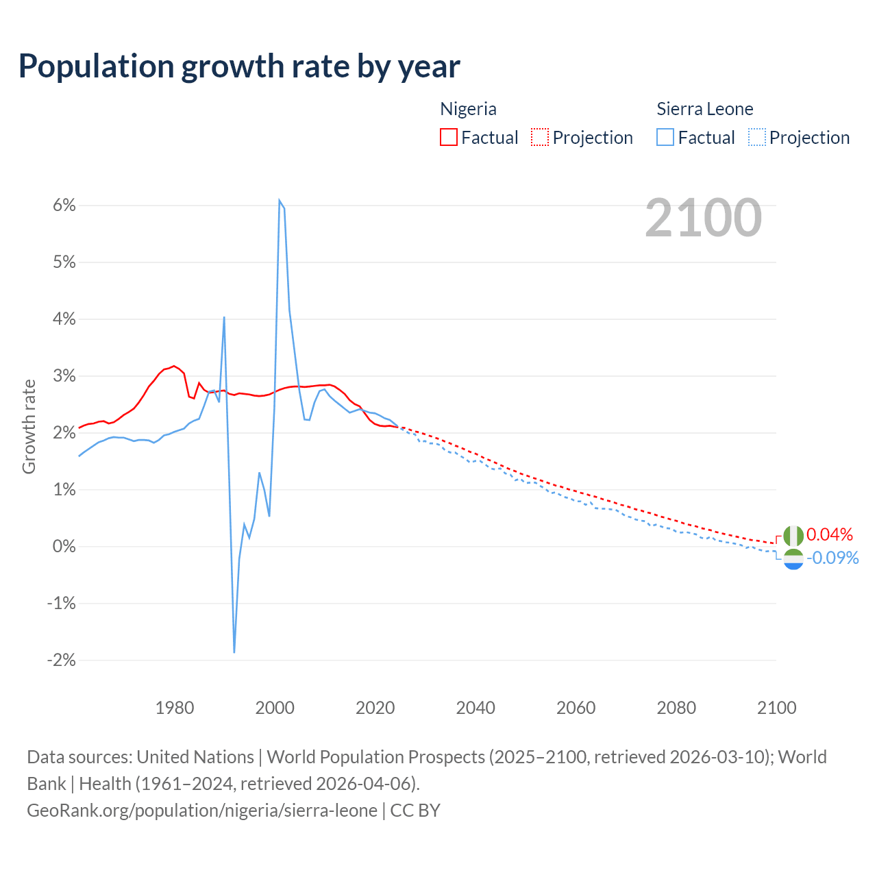 - For the last 10 years, Nigeria has had an average growth rate of +2.31% per year vs +2.32% in Sierra Leone.
