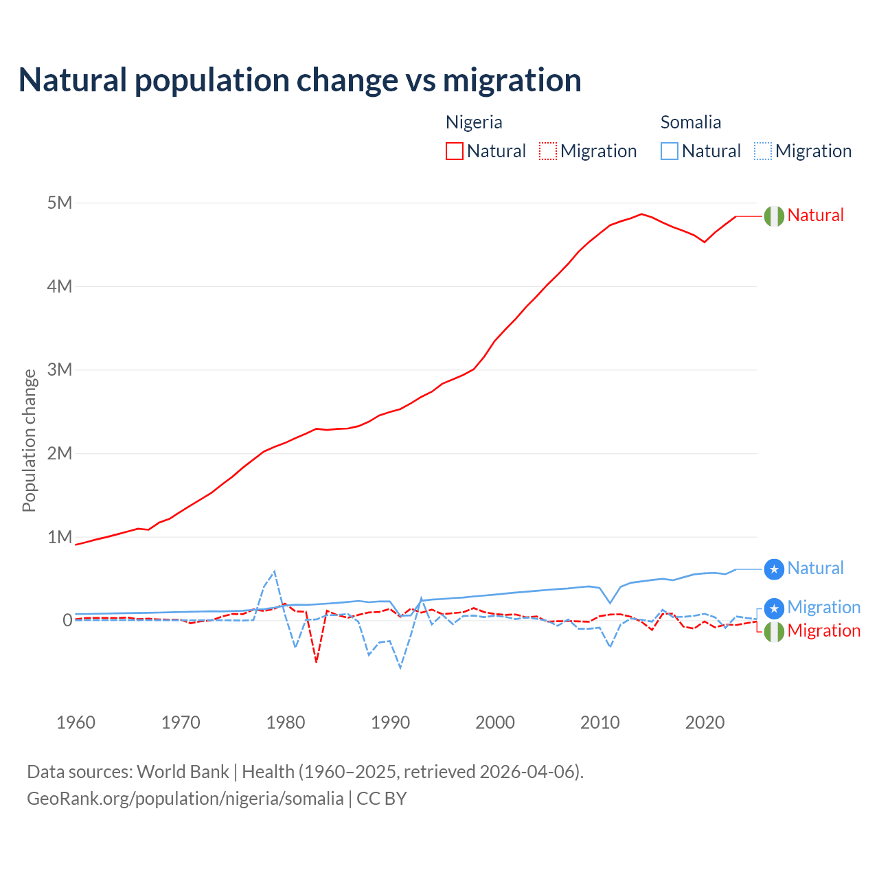 Over the last 10 years, 99.2% of the population change in Nigeria is from natural causes (a gain of 47,163,517 people) and 0.77% is from migration (a loss of 368,103 people). In Somalia 94.4% is from natural causes (a gain of 5,270,105 people) and 5.58% is from migration (a gain of 311,487 people).