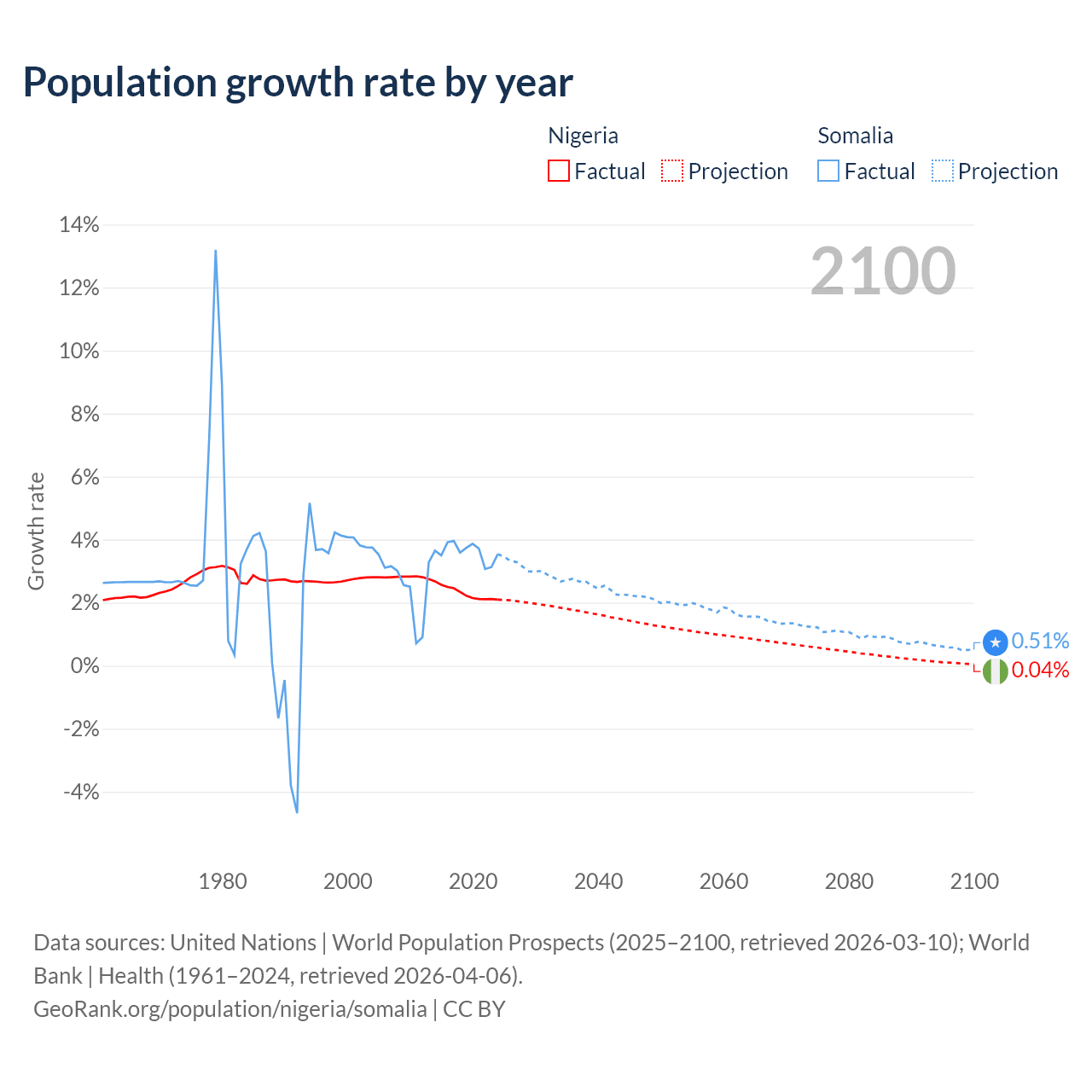 - For the last 10 years, Nigeria has had an average growth rate of +2.31% per year vs +3.61% in Somalia.
