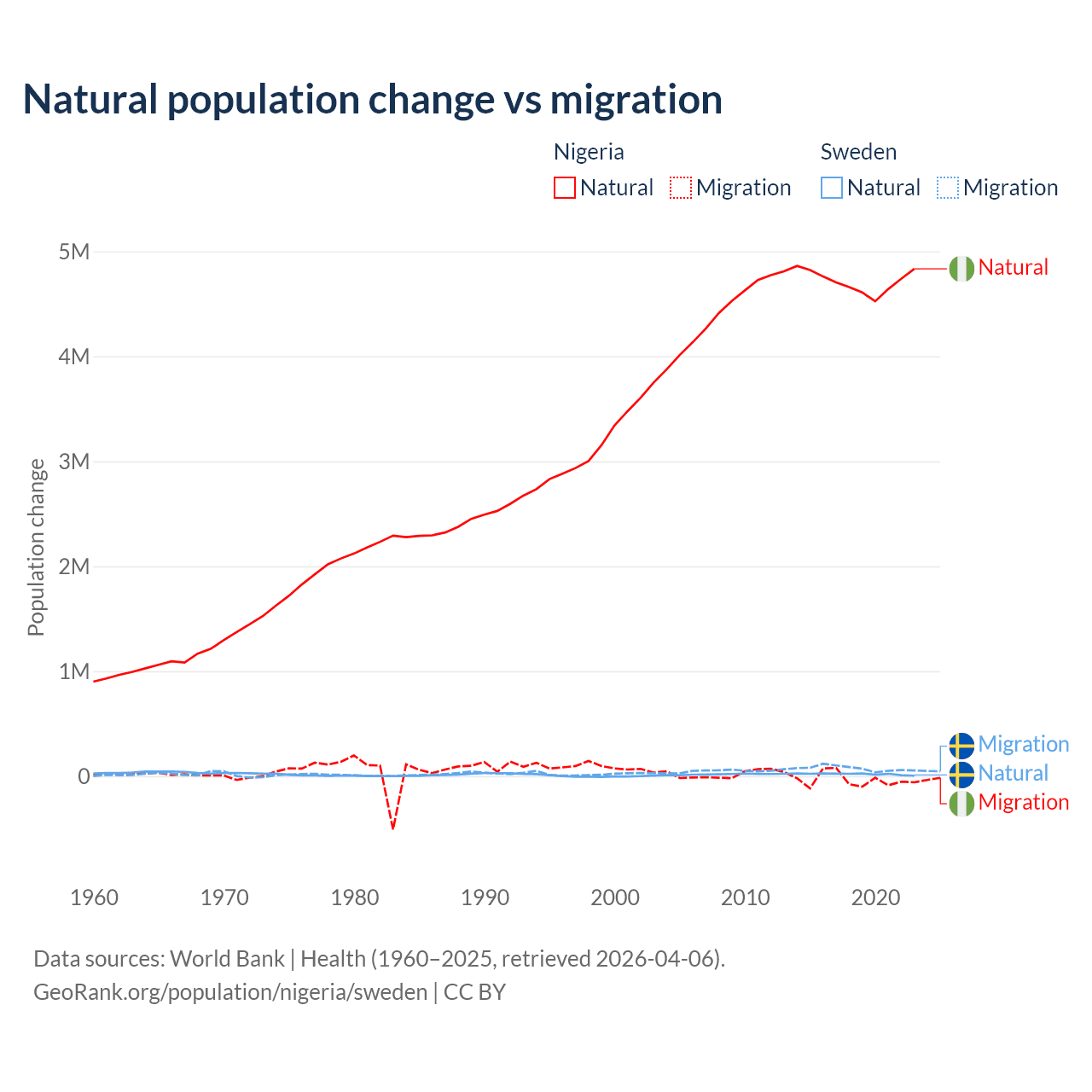 Over the last 10 years, 99.2% of the population change in Nigeria is from natural causes (a gain of 47,163,517 people) and 0.77% is from migration (a loss of 368,103 people). In Sweden 21.4% is from natural causes (a gain of 201,900 people) and 78.6% is from migration (a gain of 743,642 people).