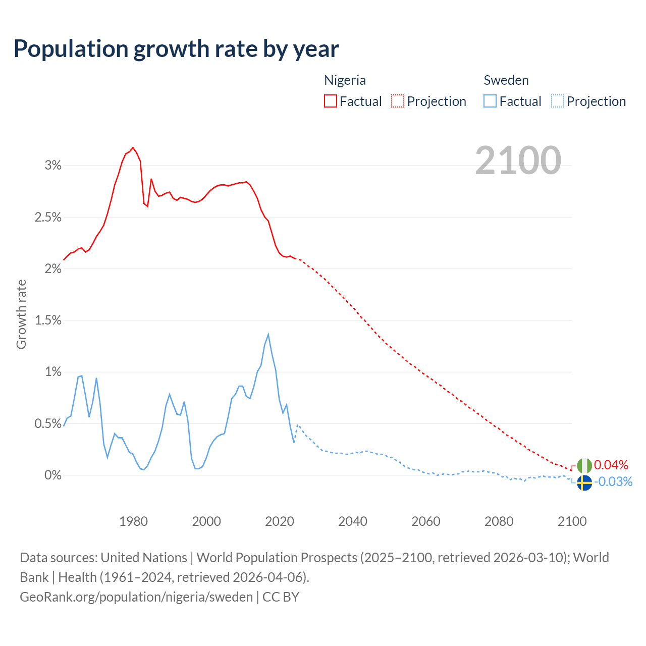 - For the last 10 years, Nigeria has had an average growth rate of +2.31% per year vs +0.88% in Sweden.