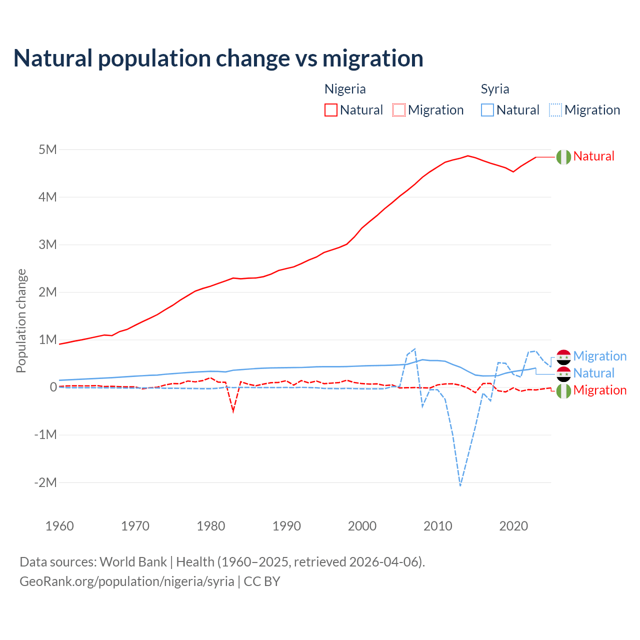Over the last 10 years, 99.2% of the population change in Nigeria is from natural causes (a gain of 47,163,517 people) and 0.77% is from migration (a loss of 368,103 people). In Syria 91.3% is from natural causes (a gain of 3,047,621 people) and 8.72% is from migration (a gain of 291,069 people).