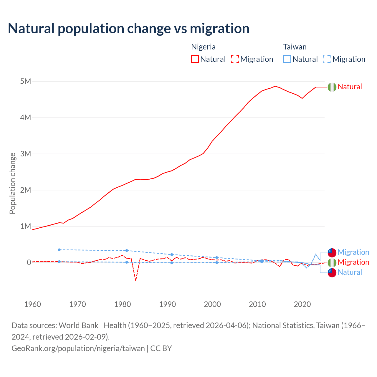 Over the last 10 years, 99.2% of the population change in Nigeria is from natural causes (a gain of 47,163,517 people) and 0.77% is from migration (a loss of 368,103 people). In Taiwan 56.7% is from natural causes (a loss of 57,467 people) and 43.3% is from migration (a gain of 43,884 people).