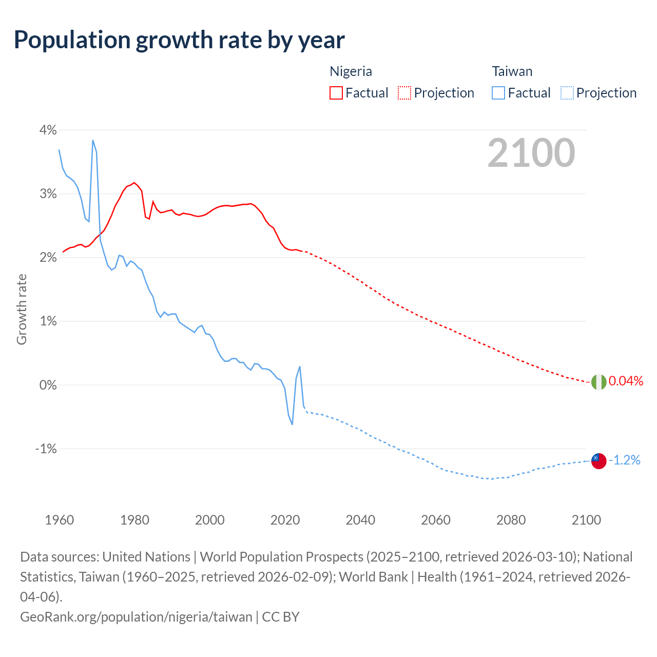 - For the last 10 years, Nigeria has had an average growth rate of +2.31% per year vs -0.03% in Taiwan.