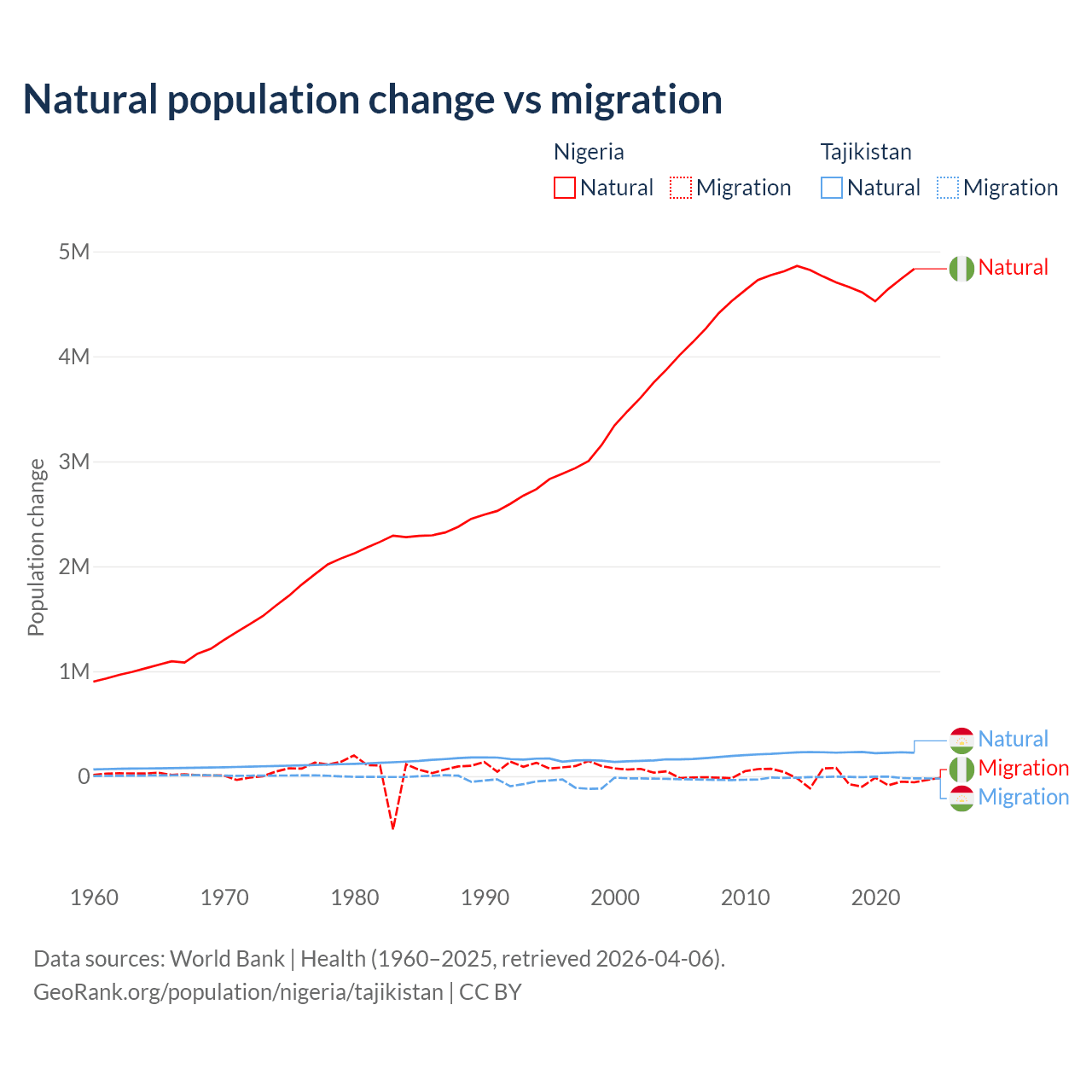Over the last 10 years, 99.2% of the population change in Nigeria is from natural causes (a gain of 47,163,517 people) and 0.77% is from migration (a loss of 368,103 people). In Tajikistan 96% is from natural causes (a gain of 2,266,045 people) and 3.95% is from migration (a loss of 93,205 people).