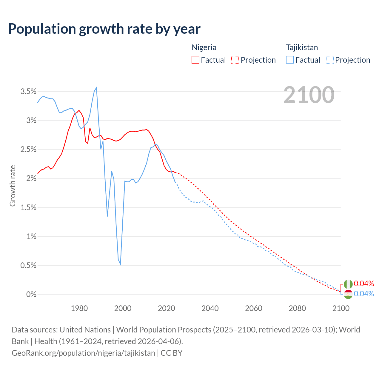 - For the last 10 years, Nigeria has had an average growth rate of +2.31% per year vs +2.33% in Tajikistan.